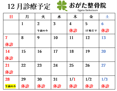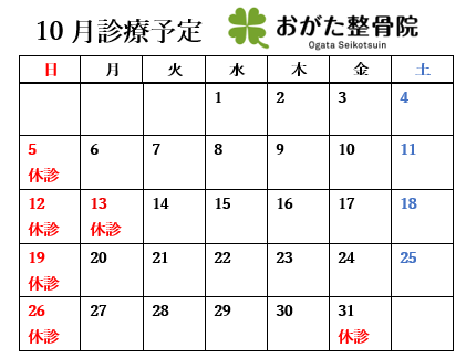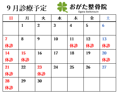 | 【受付時間】 午前9:00~12:30 午後15:00~19:30 【休診日】 祝日・日曜日/上記以外、研修の為休診有 各種保険取り扱い・交通事故・労災 最終受付は受付時間30分前まで |