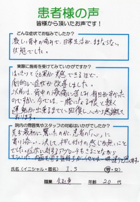 ![]() ![]() | Qどんな症状でお悩みでしたか? 激しい背中の痛みで、日常生活がままならない状態でした Q実際に施術を受けてみていかがですか? はっきりと効果が実感できるほど、劇的に症状が改善しました 以前は背中の激痛に苦しみ毎日が辛かったのですが今では1歳になる娘と軽く運動が出来るまでに回復し、心から感謝しております。 Q院内の雰囲気やスタッフ対応はいかがでしたか? 先ず最初に驚いたのが患者の「心」に寄り添い、決して押し付けの感じが無いことでした。症状に対するアプローチもさることながらそういった内面を労る気持ちが他とは一味違うと思います。 20代 男性 I,S 様 職業:会社員 |