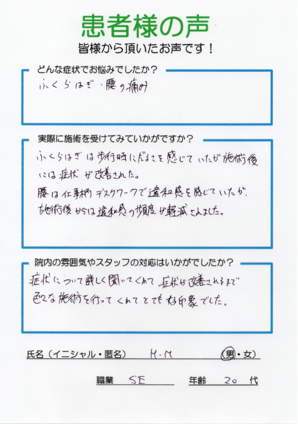 ![]() ![]() | Qどんな症状でお悩みでしたか? ふくらはぎ・腰の痛み Q実際に施術を受けてみていかがですか? ふくらはぎは歩行時にだるさを感じていたが施術後には症状が改善された。 腰は仕事柄デスクワークで違和感を感じていたが施術後からは違和感の頻度が軽減されました。 Q院内の雰囲気やスタッフ対応はいかがでしたか? 症状について詳しく聞いてくれて、症状が改善されるまで色々な施術をお行ってくれてとても好印象でした。 20代 男性 H・M 様 職業:SE |
