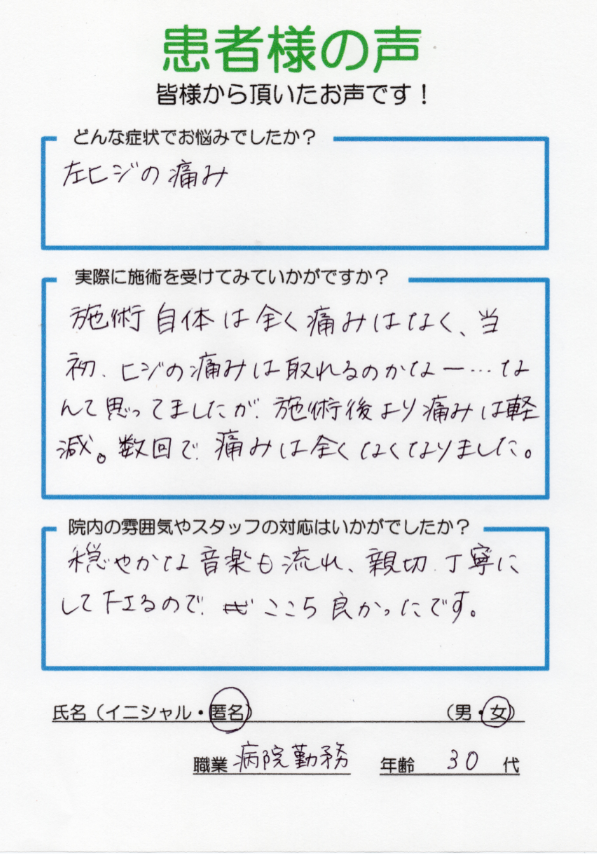 ![]() ![]() | Qどんな症状でお悩みでしたか? 左ヒジの痛み Q実際に施術を受けてみていかがですか? 施術自体は全く痛みはなく、当初、ヒジの痛みは取れるのかなー・・・なんて思っていましたが、施術後より痛みは軽減。数回で痛みは全くなくなりました Q院内の雰囲気やスタッフ対応はいかがでしたか? 穏やかな音楽も流れ、親切丁寧にして下さるのでここち良かったです 30代 女性 匿名 職業:病院勤務 |