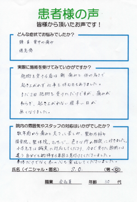 ![]() ![]() | Qどんな症状でお悩みでしたか? 頭、首、背中の痛み 倦怠感 Q実際に施術を受けてみていかがですか? 施術を受ける前は朝 痛みと体の怠さで起き上がれず仕事を休む日もありました。まだ2回施術を受けただけですが、痛みが和らぎ、起き上がれない程辛い日が無くなりました。 Q院内の雰囲気やスタッフ対応はいかがでしたか? 数年前から痛みと怠さに苦しみ、整形外科や接骨院、整体院、マッサージ、、、色んな所へ相談に行きました。今まで受けた診断とは違う自分でも納得する原因を見付けてくださいました。身体だけでなく私の心も楽にしてくださいました。 30代 女性 S.O. 様 職業:会社員 |
