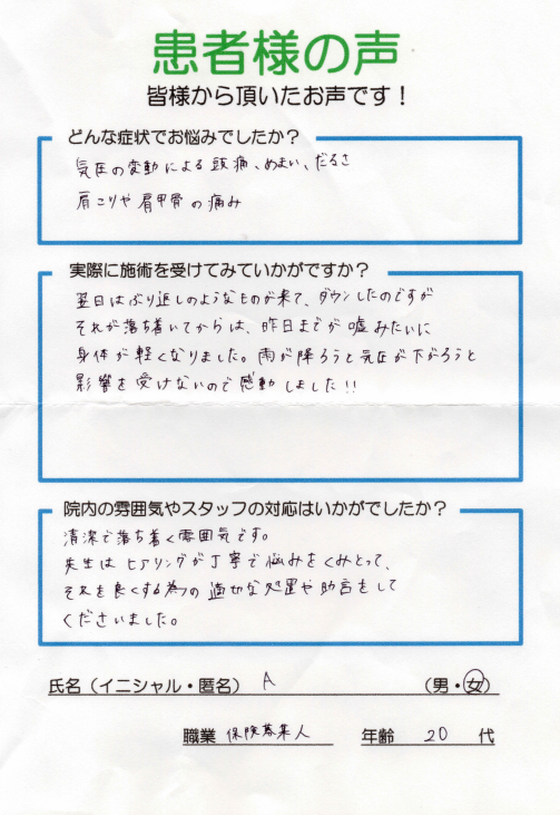 ![]() ![]() | Qどんな症状でお悩みでしたか? 気圧の変動による頭痛、めまい、だるさ 肩こりや肩甲骨の痛み Q実際に施術を受けてみていかがですか? 翌日はぶり返しのようなものが来て、ダウンしたのですがそれが落ち着いてからは、昨日までが嘘みたいに身体が軽くなりました。雨が降ろうが気圧が下がろうが影響を受けないので感動しました!! Q院内の雰囲気やスタッフ対応はいかがでしたか? 清潔で落ち着く雰囲気です。 先生はヒアリングが丁寧で悩みをくみとって、それを良くする為の適切な処置や助言をしてくださいました。 20代 女性 A 様 職業:保険募集人 |