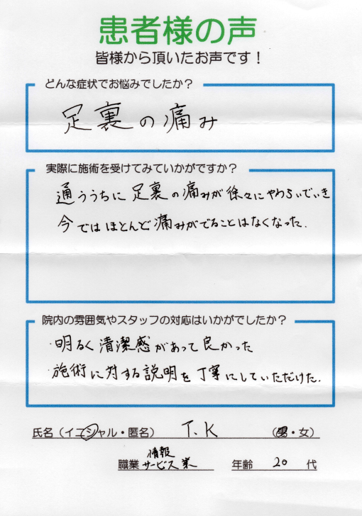 ![]() ![]() | Qどんな症状でお悩みでしたか? 足裏の痛み Q実際に施術を受けてみていかがですか? 通ううちに足裏の痛みが徐々にやわらいでいき今ではほとんど痛みが出ることはなくなった。 Q院内の雰囲気やスタッフ対応はいかがでしたか? 明るく清潔感があってよかった 施術に対する説明を丁寧にしていただけた。 20代 男性 T.K 様 職業:情報サービス業 |