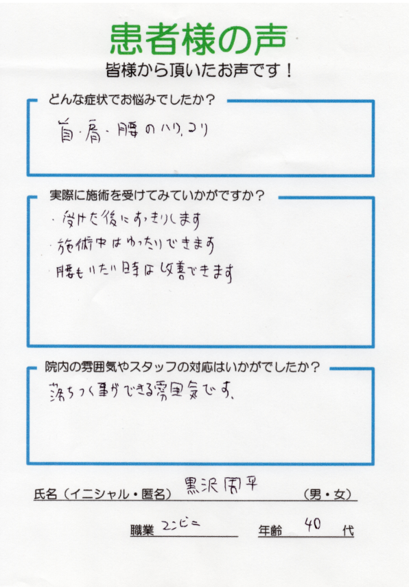 首は約3~4㎏ある頭部を支えています。何もしていなくとも首には相当な負担がかかっていて、長い時間おなじ姿勢のままパソコン作業などを続けると、筋肉が疲労をおこしたり血流の流れが悪くなると首の痛みや肩こりもおきます。 また肩甲骨や肩関節の動きが悪くなり頭痛や眼精疲労につながるケースもあります。 おがた整骨院では姿勢やクセ、身体のバランスなど検査しながら原因に対して施術を行っていきます。 |