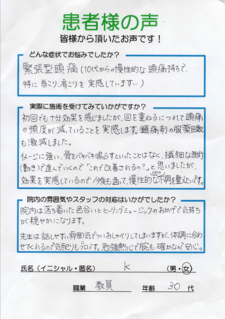 頭痛は頭の筋肉の緊張(筋緊張型)によって起こるものや頭の血管の拡張(片頭痛)によって起こるものなど、これ以外にも様々な原因が考えられます。 頭痛の種類の中でも特に多いのが「緊張型頭痛」です。 緊張型頭痛は、緊張により血流が悪くなり、周囲の神経を刺激したりすることで痛みにつながります。 特に午後から夕方にかけて、目の疲れや倦怠感などとともに痛みが現れやすいと言われ、発症すると、後頭部から首筋を中心に頭全体がギューッとしめつけられるように痛みます。 片頭痛の場合は脳の血管が拡張子、神経を圧迫することで症状が現れます。緊張型頭痛とは正反対の要因であることがポイントです。血管が広がる原因には様々あります。例えば、自律神経の調整がうまくいかないことや女性ホルモンの変動。寝すぎ、寝不足などが原因とされています。 おがた整骨院では頭痛は、肩こり・眼精疲労・骨盤の歪み・自律神経、など様々な症状の原因に合わせ施術内容は1人1人強く影響を与えている原因箇所に対しアプローチをします。 頭痛が毎日出ているような場合、施術後に全く頭痛が出なくなった!という例もありますが、施術を継続して受けて頂き 『毎日あった頭痛が3日おきに』『週1に』『1ヶ月間でたまに』など、段階的に改善していくものとお考え下さい。 ※下記の症状の場合は 緊急を要する可能性がある為 急いで病院を受診してください これまで経験したことのない激しい頭痛 起床時に起こる強い頭痛 発熱を伴った強い頭痛 頭をぶつけた後の強い頭痛 嘔吐をともなう強い頭痛 物がダブって見えたり、しびれ、ふらつき、言語、意識障害を伴う頭痛 |